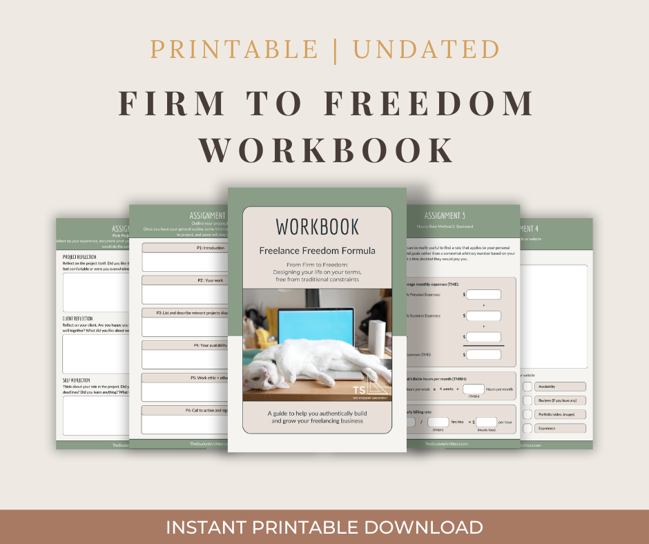 The Firm to Freedom Workbook is packed with 35 pages of practical tools like checklists, quizzes, exercises, and actionable tasks to help you identify your ideal clients, set your rates, spot red flags in potential jobs and clients, and so much more.